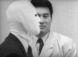 To visually evoke Okuyama’s identity-split, Teshigahara frequently frames him in a mirror, or fits his face into composition with the face of Dr K, his alter-ego