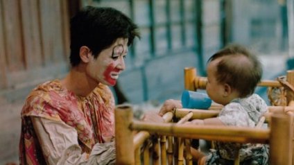 Thus this man effectively humiliates himself, walking around in absurd clown make-up and (in a society where this matters a great deal) literally losing face, all while ineffectively trying to entice people to the local movie theatre. In the end, his boss at least recognises his determination and hires him to work on-site at the cinema, but by then comic irony strikes: his toddler son no longer recognises him without the clown outfit and cries until he dons it again.