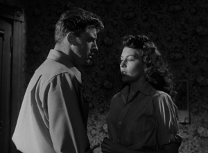 But where this film really comes to define the film noir aesthetic is in its use of lighting effects, mixing dark shadows with intense luminous shafts to create high-contrast compositions. Siodmak, like so many of the directors who built up the film noir canon, was a European emigré to Hollywood. In Germany, he had been directly familiar with German Expressionist cinema, where the inner mood of characters was reflected externally in the world they live in, in the sets, in the lighting. All these external elements come to express something about the general interior psychology. Film noir takes this idea and infuses its seedy universe with unbalanced lighting that makes even the most inconspicuous of settings seem unnatural and off-kelter. The even lighting and soft focus of more cheery Hollywood genres is no longer appropriate, except to be contrasted with the more pervasive shadows of noir. Just look at the difference between the cosy domestic life of Sam and Lilly Lubinsky in its even, balanced lighting, versus the prominent shadows standing in for the inner turmoil of Swede and Kitty.
