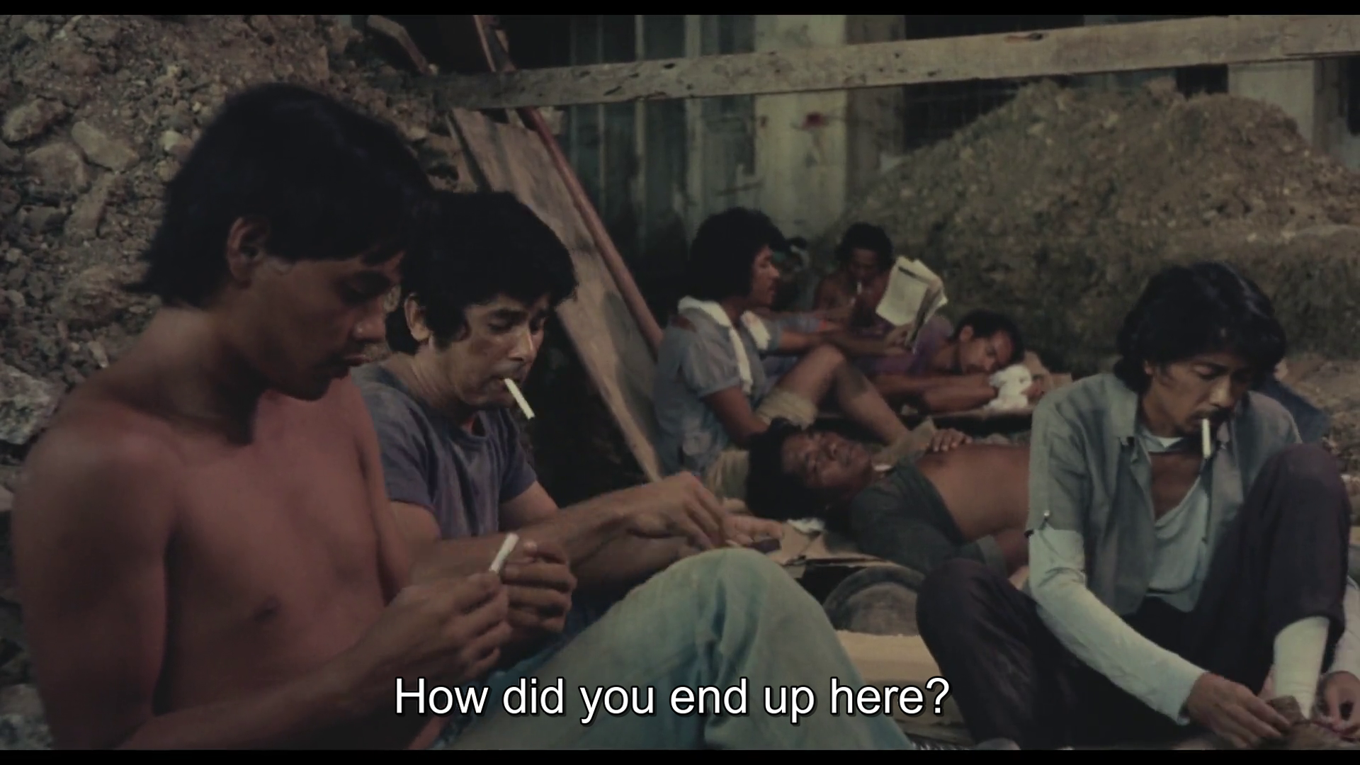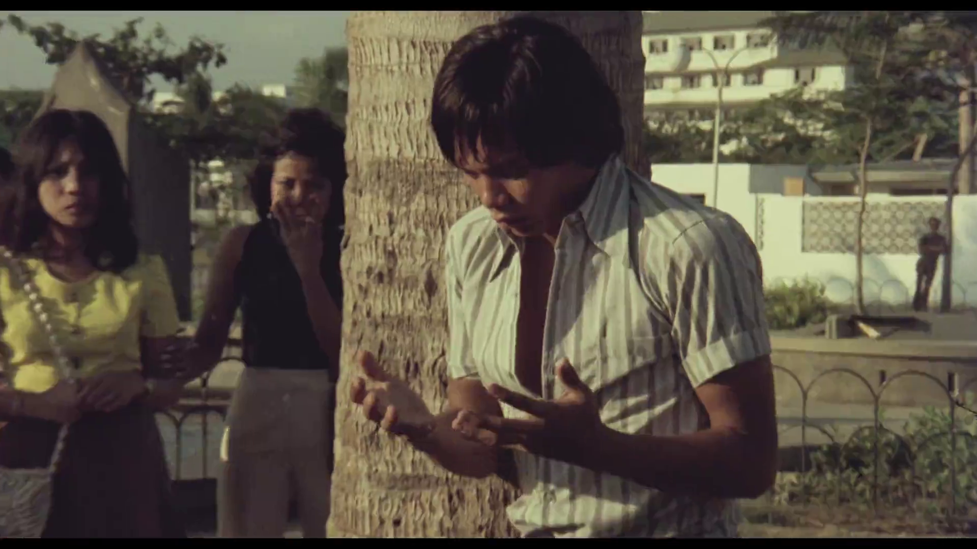 At its core, Manila in the Claws of Light is an archetypal narrative of rural boy moving to the city, as well as a quest narrative, but one where the hero’s transformation is a descent into corruption and corrosion. Julio Madiaga (played with cherubic innocence by then-newcomer Bembol Roco) is a young fisherman from the rural island province of Marinduque, who arrives in the capital searching for Ligaya Paraiso (Filipina screen legend Hilda Coronel although she gets little screen-time here), his vanished girlfriend lured to Manila by promises of work and schooling. Her name (Ligaya means “joy” and Paraiso means “paradise”) quickly becomes painfully ironic, a memory that haunts Julio as he’s absorbed into the city’s underworld. He finds work on a high-rise construction site (Image 1), faints from hunger, sleeps on-site, and is later drawn into sex work when left jobless. The city doesn’t simply challenge him, it eats away at his soul, from one job exploiting his body’s labour to another, gradually stripping away his innocence and humanity. At one point, unleashing his pent-up frustration by brutally beating a pickpocket in broad daylight, he looks at his own hands in sudden realisation at what urban life has turned him into (Image 2). His search for Ligaya becomes a search for something inside himself slipping away, the ‘paradise lost’ visualised in the innocent rural flashbacks we see of Ligaya and himself as childhood sweethearts back on their island (Image 3), or perhaps simply the capacity to survive without becoming animal.