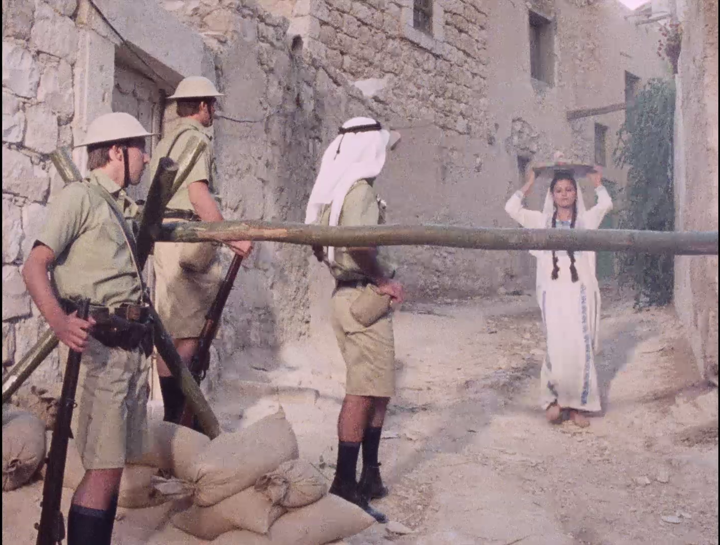 The 1920s. Post-WWI Palestine, when the post-Ottoman Middle East has been carved up by France and Britain in the infamous Sykes-Picot agreement (the British took over the lands of Palestine, Jordan and Iraq; the French of Lebanon and Syria). British troops march triumphantly into Jerusalem, a radio broadcast (again, the importance of the film’s layers of sound) noting that Lloyd George had asked for the city as a Christmas present, and received it. But where there is the exercise of power, there is resistance. In the narrow alleyways of the Old City, we see a street protest chanting “Palestine is Arab” splintering into violence as confrontational British soldiers open fire. In the balconies above, however, another story stirs. The women, confined to their kitchens and rooftops, ironically have an advantage in vantage point, their domestic sphere becoming the resistance’s high ground above the city (Image 4). From up there, they hurl pots and jugs onto the advancing British soldiers, some even pouring boiling oil down onto them (Image 5). In these narrow streets which they know far better than do the British colonisers, the domestic confinement and neighborly coordination of these women becomes tactical elevation.