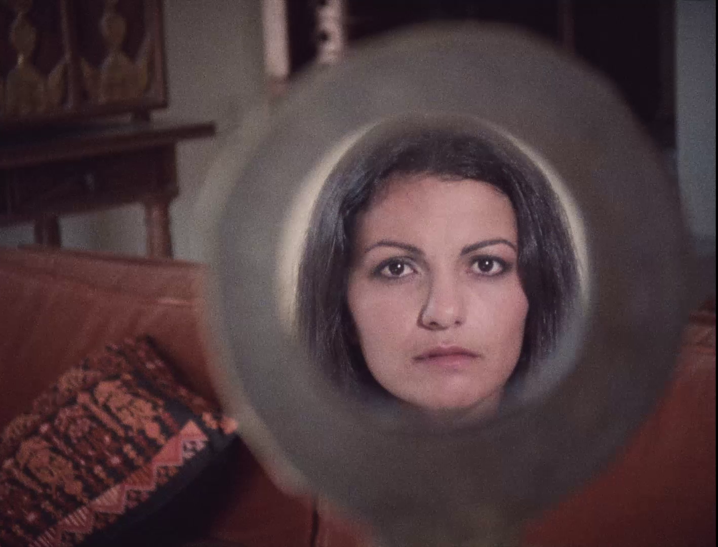 The film enters this mode in one sequence where, as the camera slowly circles around the exhibition space allowing us to see these incredible photos on the walls, the soundtrack suddenly unveils the voice of a storyteller: “Once upon a time…”. A poetic, Arabian Nights-inspired fable of invading wolves and olive groves in the historical lands of Lebanon and Palestine is spoken by an unseen woman, as the camera continues to revolve around what seems to be the empty gallery, its circular motion a visualisation of the cyclical, never-ending repetition of time’s horrors as we humans never manage to learn from history. Throughout this shot, the audio continues coming from offscreen, making us wonder who is speaking, and already hinting at the film’s interest in oral history, the importance of hidden stories within images. Finally, the camera reveals the storyteller to be present in the scene, an older woman sat on a prayer mat on the floor. Leila’s head lies on her lap, to be gently stroked while she continues her story (Image 3), as if this is her grandmother who has suddenly materialised in her gallery space and she is remembering what it feels like to be told stories as a little girl. The stories a grandmother might tell her granddaughter, the stories Srour herself saw and lived through, are not the kind of stories recorded by ‘official history.’